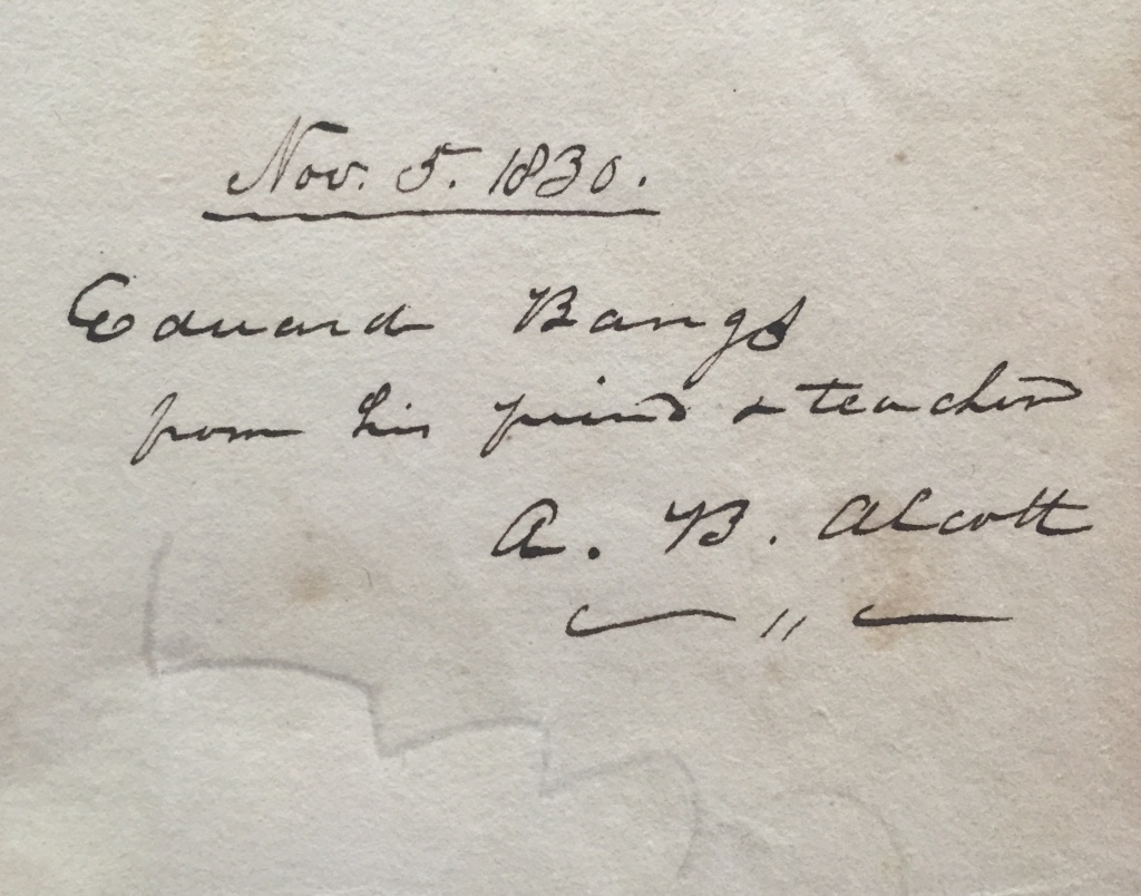 “from his friend and teacher” Amos Bronson Alcott, progressive educator and father of Louisa May Aclott, gifts a book to six-year old Edward Bangs in 1830. Edward Bangs, later a friend of Ralph Waldo Emerson, Alcott and Henry Thoreau, became an attorney who helped Thoreau’s sisters in a dispute with a neighbor.